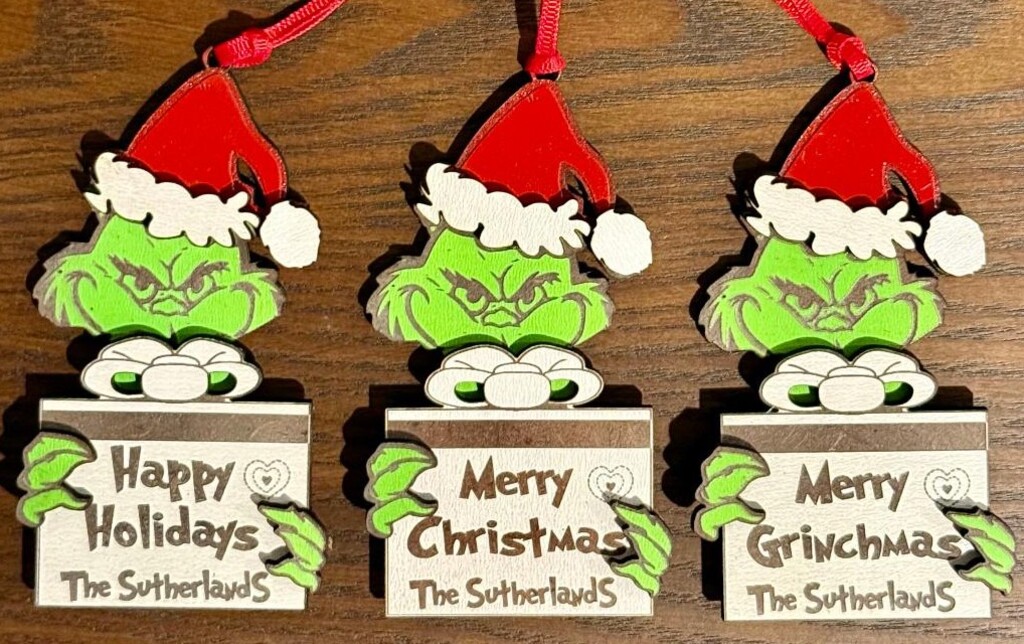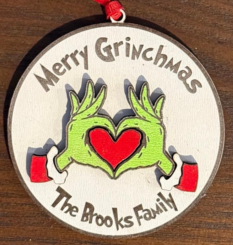 Looking to steal the hearts of your family this year? This Grinch ornament is sure to do just that! Personalize your very own Grinch ornament with your family name. This handcrafted laser engraved ornament measures 2.75” x 3.25″ and features white painted birch wood. After you place your order, just email me at unique1sb@aol.com with your family name or short text. Also check out the other picture to see the other GRINCH ornament we offer.