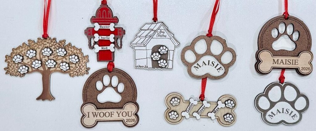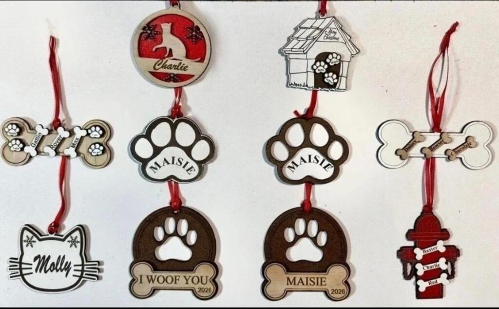 Personalize your Dog House with up to 4 Paws. After you place your order, simply email unique1sb@aol.com with your Pet's Names that will go on each paw. Also check out the gallery picture to see other ornaments we offer.