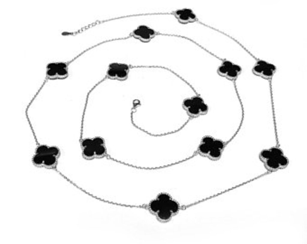 Necklace Clover "Van Cleef Style 36" Black Onyx Sterling Silver Rhodium Plated White, Tarnish Proof