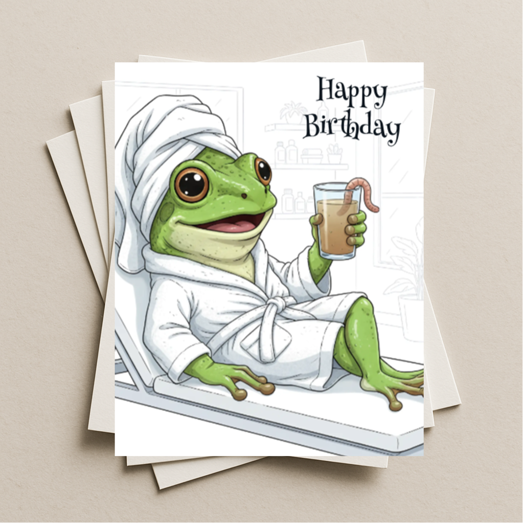 Birthday green tree frog celebrating at the health spa greeting cards feature artist-designed and AI-generated animal images that are perfect for sending to family and friends who love animals and appreciate a thoughtful gift. Our cards are made with high-quality cardstock and vibrant ink, so they stand out and become a special keepsake for your loved ones.