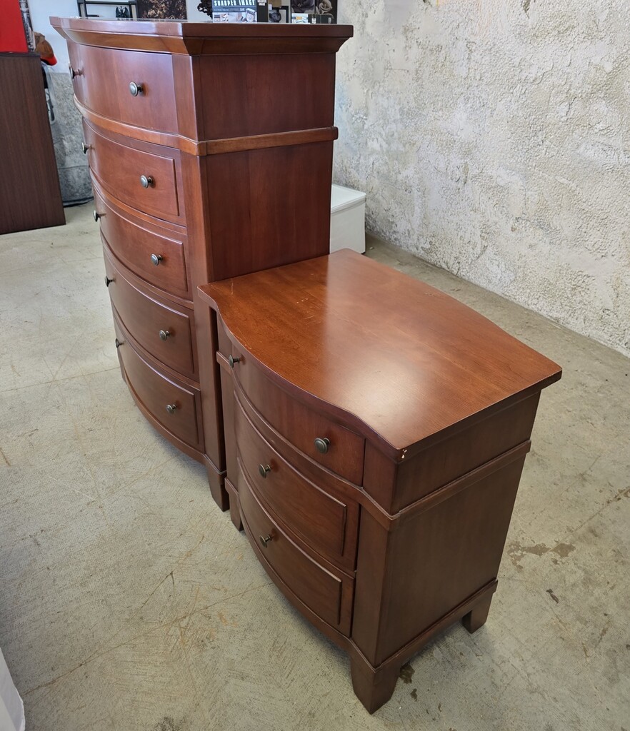 This set of Broyhill furniture consists of a tall vertical chest and a matching nightstand, both crafted in a classic, transitional style with a warm cherry finish. Each piece features distinct, outward-curving drawer fronts that add a soft, elegant dimension. Dark, circular metal pull knobs provide a subtle contrast against the rich wood tone. The tops have a "stepped-out" design with beveled edges, sitting slightly wider than the frame below.