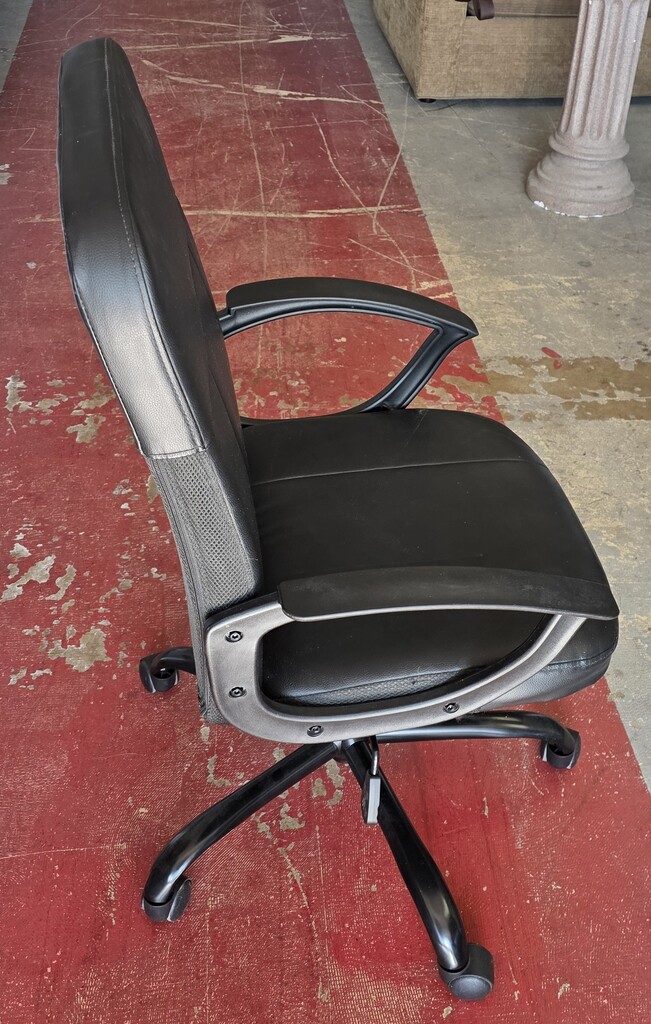 This is a classic black leather executive office chair designed for professional or home office use. It features a high-back design with segmented padding for ergonomic support.