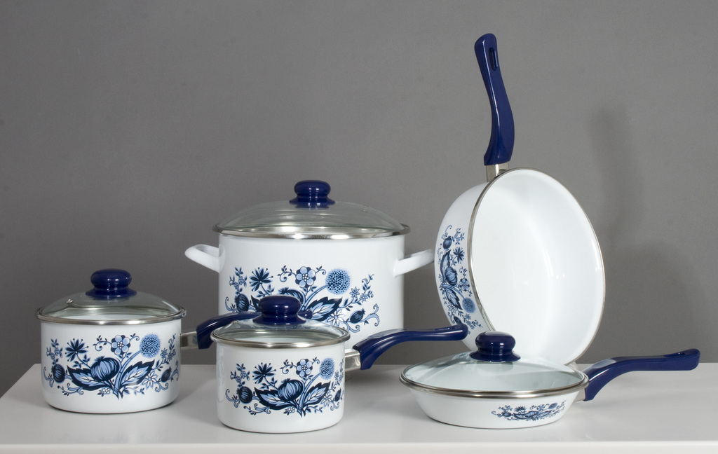 Enamel cookware made in Europe. 5 pieces of cookware and 4 glass lids