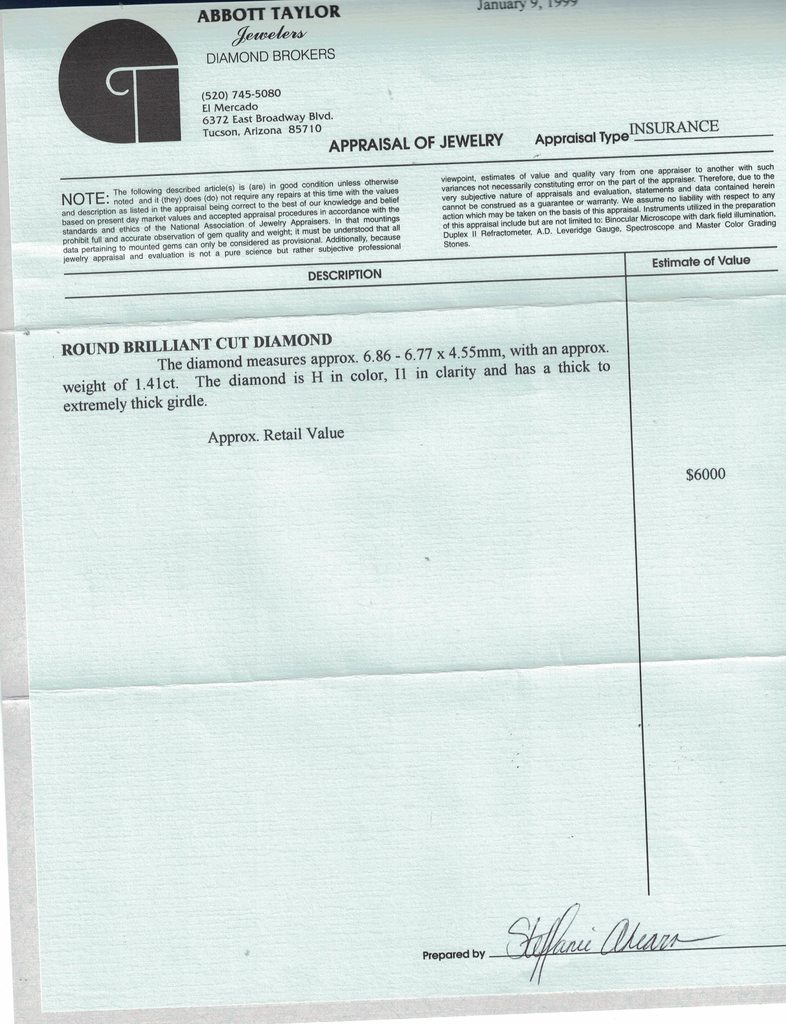 Please see appraisal shown. Nice 1.41 Carat round H color loose diamond. Current retail value $6,900,