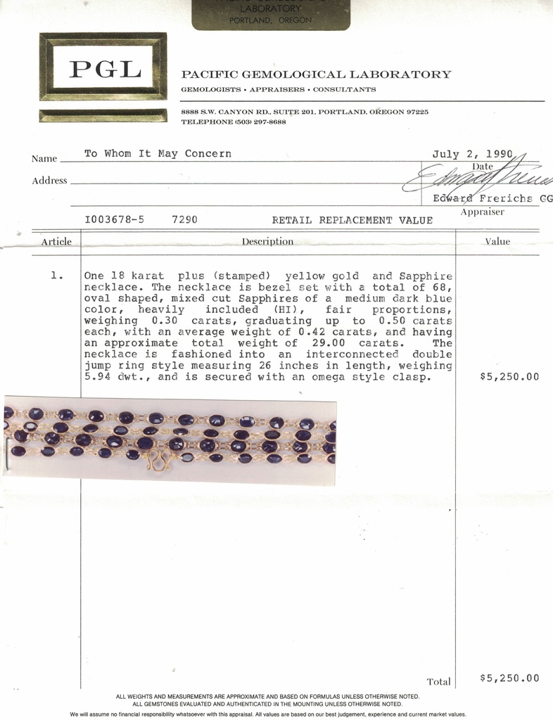 Very nice ladies gold and sapphire necklace. Feature 68 individual sapphires of a medium dark blue color. Length is 24 inches. Current appraised value is $6,415.
