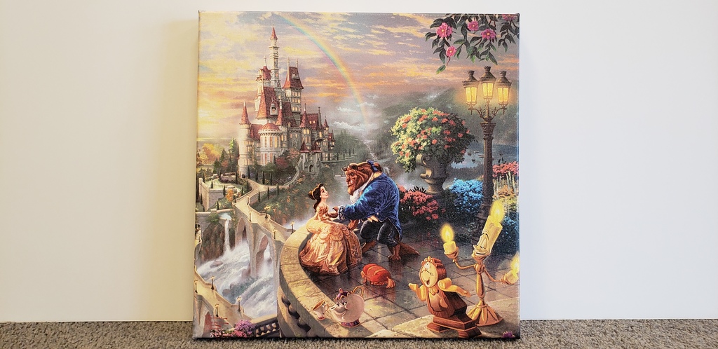"Beauty and Beast Falling in Love" open edition 14 x 14 gallery wrap by Thomas Kinkade. This is a Thomas Kinkade collectible.