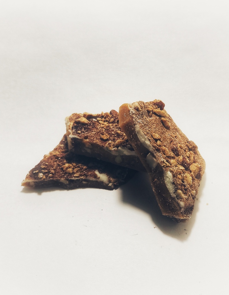 Almond Toffee topped with White Chocolate, Cinnamon Sugar, Candied Almonds