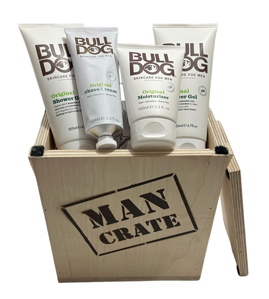 You will receive a handcrafted man crate filled with 4 Popular Bull Dog Men's Grooming items. Bull Dog items may vary from what is pictured.